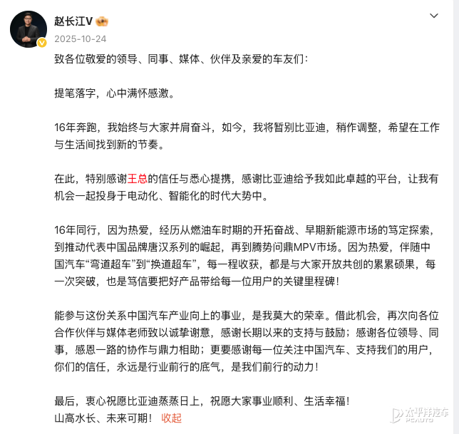 2025年7月因比亚迪轮岗,与方程豹直营事业部总经理李慧对调,负责方程豹直营业务。同年10月24日,赵长江发文宣布离开比亚迪,结束16年任职。(文:太平洋汽车吴启星)