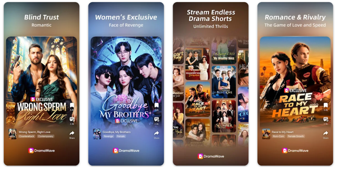 DramaWave短剧类型丰富,女频、情感、都市类题材占比较高,从浪漫爱情到悬疑惊悚均有涉及,同时尝试提供“神豪”类国内热门题材。此外,还涵盖狼人、吸血鬼等带有西方元素的短剧,拥抱西方本土文化、满足全球用户的多元化需求。