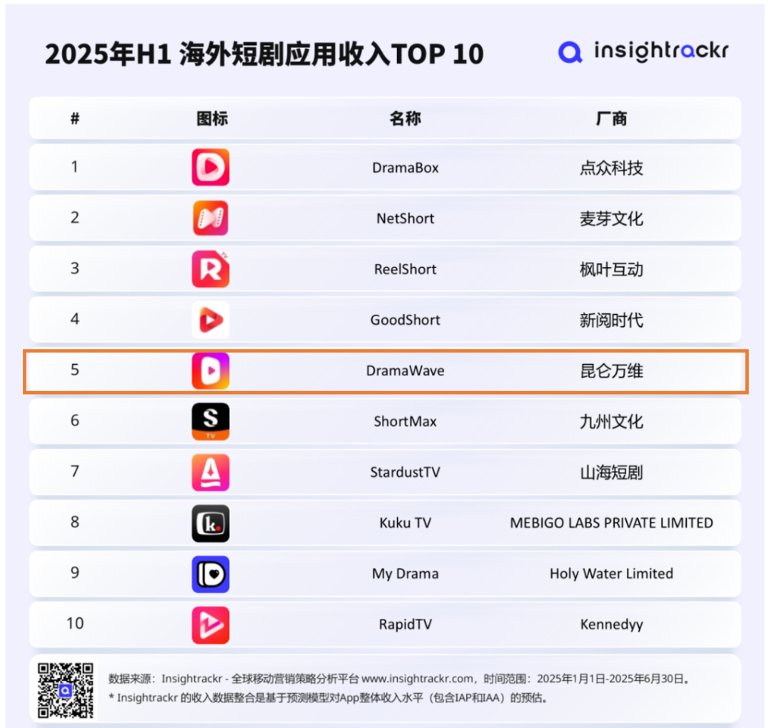 根据Insightrackr数据,DramaWave位列2025年上半年海外短剧应用下载量第四,环比增长1084%;位列2025年上半年海外短剧应用收入第五。
